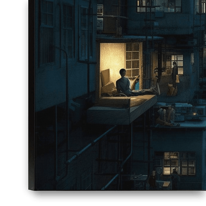 "Illuminated Solitude" is a work that captures the delicate balance between isolation and urban beauty. The artwork, depicts a nocturnal scene of a densely populated city in which individuals are isolated within the familiar walls of their flats.