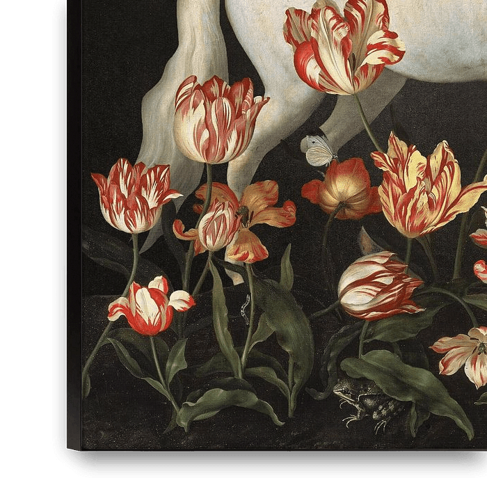 In the foreground, the legendary striped tulips, taken from a still life by Johannes Bosschaert, shine…