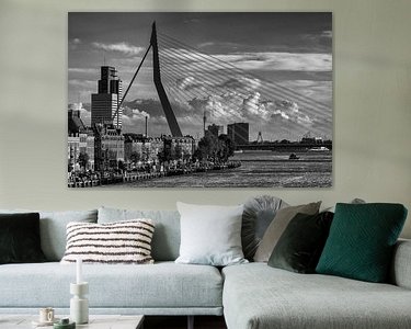 The Erasmus Bridge with North Island in the foreground in Rotterdam. Noordereiland is really still a working-class area in the middle of the big city of Rotterdam. The Erasmus Bridge provides a good connection between Rotterdam-Zuid and the centre of Rotterdam. The Erasmus Bridge is 802 metres long and 139 metres high. The bridge was opened in October 1996.