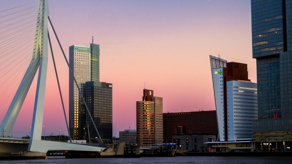 This photo was taken with a slow shutter speed giving the water a hazy glow. The sun had just set when the photo was taken, resulting in a beautiful pink background of the city. Some of the lights in the buildings are already on and also those on the Erasmus Bridge so that it gets extra attention. The recognisable buildings stand…