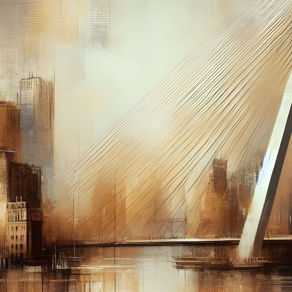 Be enchanted by the abstract splendour of Rotterdam's Erasmus Bridge, captured in shades of gold and brown in this unique painting. Bring the dynamics of the city to life in your home or office with this masterpiece, which is both modern and timeless. Bring a piece of Rotterdam allure into your home and enjoy the iconic beauty of the Erasmus Bridge every day.