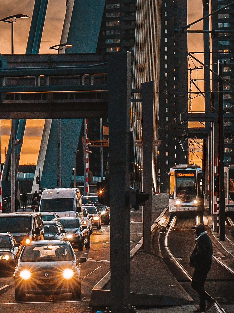 This photo was taken from Wilhelminaplein in Rotterdam. Personally, I like photos in which a lot is happening. In this case, cars's waiting at a traffic light, a pedestrian quietly crossing, trams passing each other in the background.