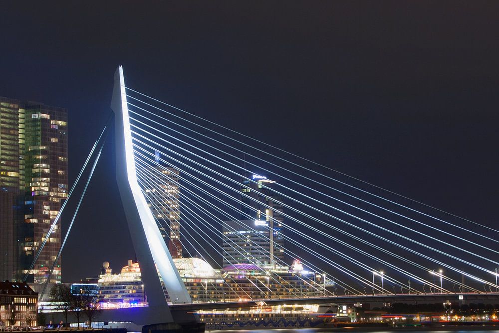 The Erasmusbridge (Erasmusbrug) in the dark with the cruiseship Aidaprima behind the bridge.