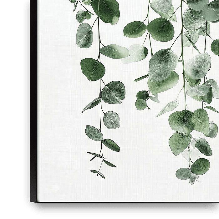 This art print shows a gentle cascade of eucalyptus branches stretching gracefully over a white background. The lush green tones of the leaves bring a refreshing and tranquil atmosphere to any setting. The detailed depiction of the leaves adds a natural depth and texture to the artwork. This composition is perfect for modern interiors…