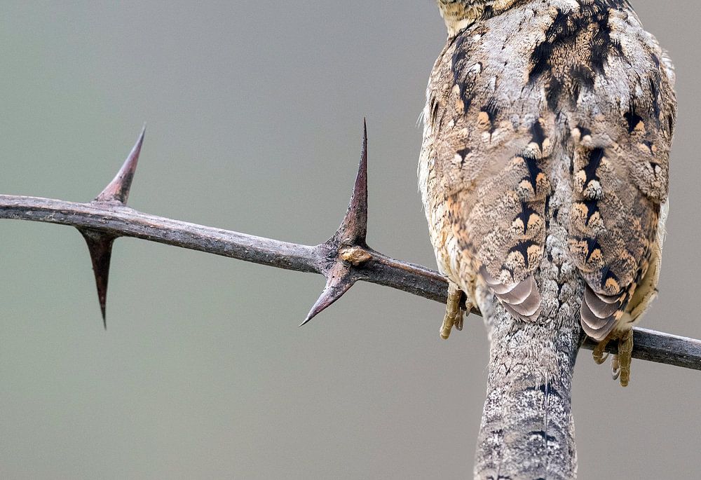 Eurasian Wryneck (Jynx torquilla) in the Aosta valley in northern Italy. Perched on a spiny twig, looking over ist shoulder.