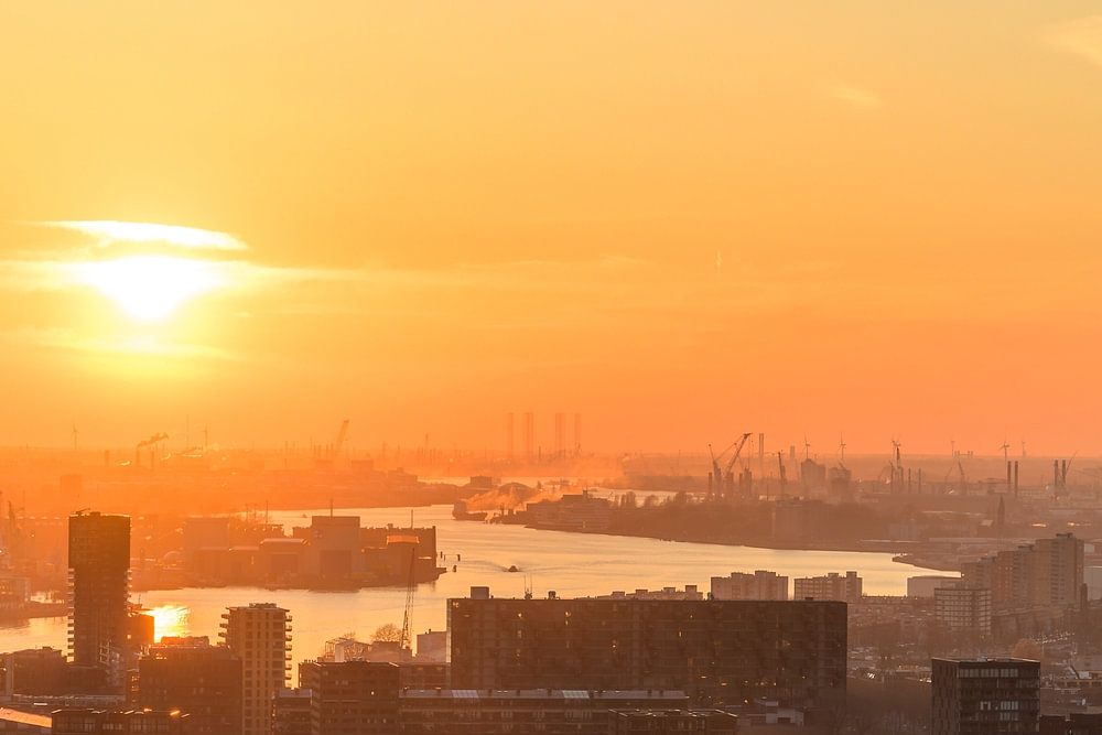 Euromast Rotterdam sunset skyline from a height view at the New Maas. In the far distance the port of Rotterdam is visible on the horizon. The Euromast on the right, standing at 185 meters tall, it was originally built in 1960, designed by architect Huig Maaskant and engineer G. J. de Haan, and it remains one of the tallest structures in the city of Rotterdam.