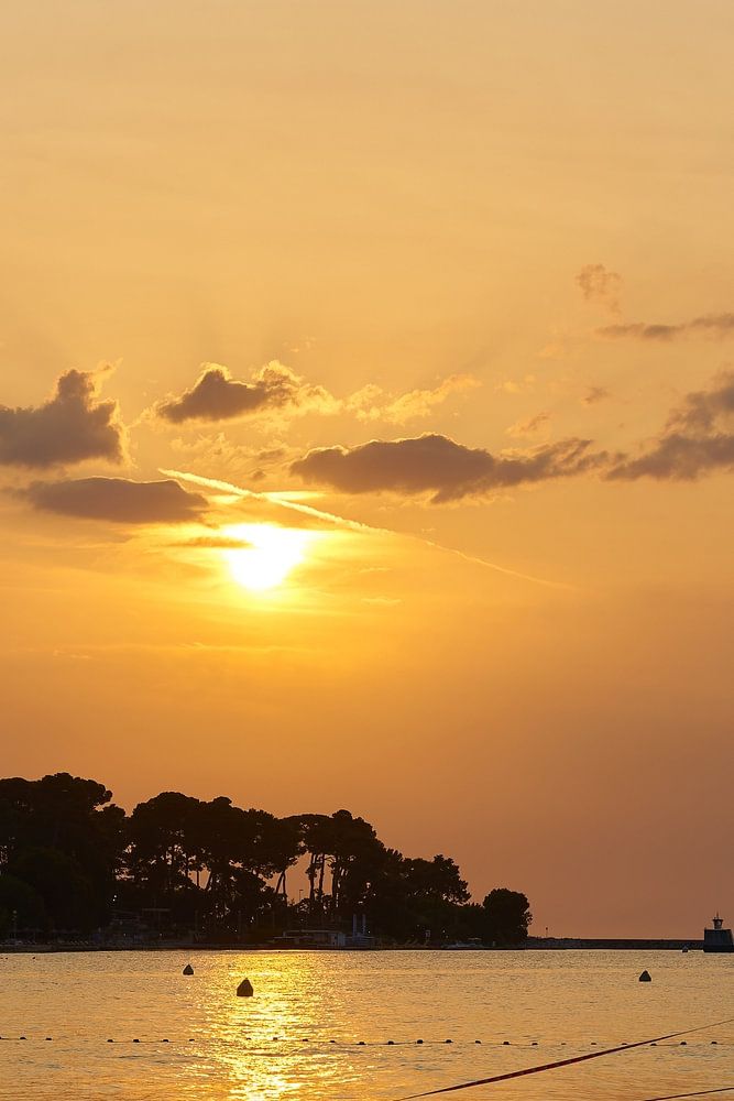 Romantic sunset on a warm summer's day on the Adriatic Sea on the coast of Porec in the Istria region of Croatia. The island of Sveti Nikola in the background