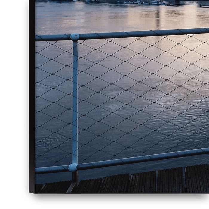 Two bicycles rest against the railing, facing the water and the city beyond. They function as silent witnesses of movement, while they themselves have come to a standstill. The river reflects the last light of the day, forming a gentle transition between foreground and skyline.