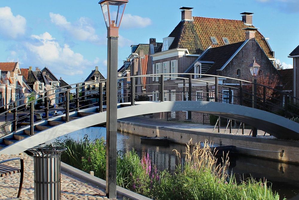 The quaint town of Kollum in Friesland in the Netherlands on a sunny summer's evening. View of the Trekvaart waterway, waterfront houses and the pedestrian bridge.