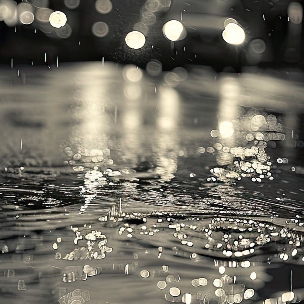 Atmospheric black-and-white photograph of a rainy city. Points of light reflect on the wet road surface.