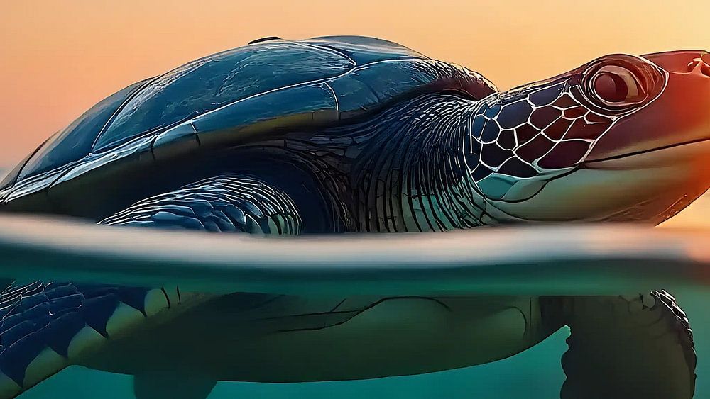 The sky above turns into a canvas of vibrant colours as the turtle finds its way through the water undisturbed. Small fish play around it, dancing in joyful shoals around the gentle creature and emphasising the peaceful atmosphere of the moment. Delicate plays of light appear on the surface of the water, reflecting the light of the setting sun and creating an image of perfect harmony between animal and nature.