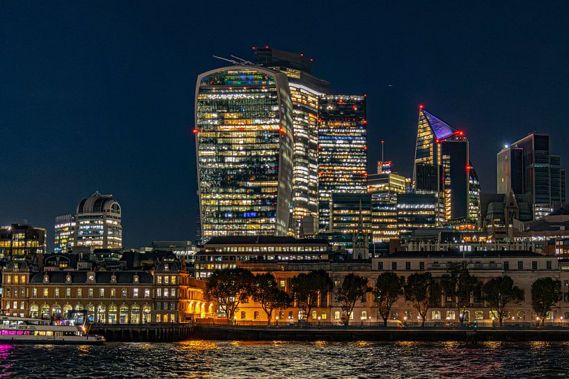 An atmospheric evening shot of London's skyline, with illuminated buildings along the River Thames. The lights of the financial district reflect in the water, giving the city an elegant, vibrant look. A powerful cityscape that fits perfectly into a modern interior or office space.