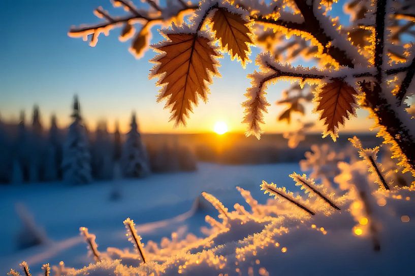 The photograph reveals a breathtaking, snow-covered winter landscape at the moment of sunset and combines clear coldness with the magic of warm colours. Endless expanses of snow and gently rolling hills lie there as if dusted with icing sugar; their smooth surface reflects the last rays of the setting sun and transforms white expanses…