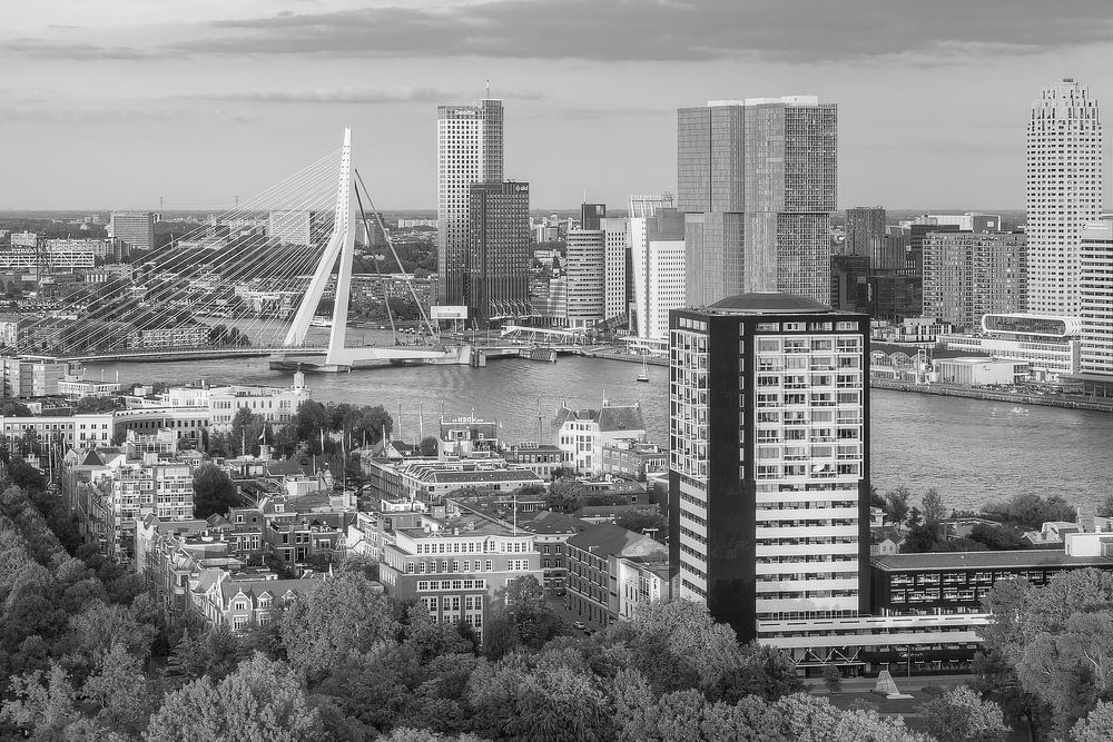 Buy this of Rotterdam Evening sun in Rotterdam black and white by Michael Valjak on canvas, ArtFrame, poster and wallpaper, printed on demand in high quality.