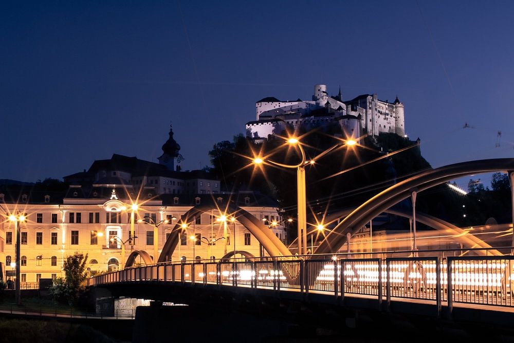 This photo shows a great evening atmosphere with a view of the Hohensalzburg Fortress and Karolinenbrücke.