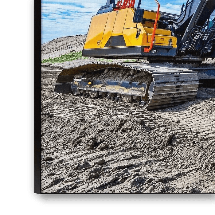 Heavy construction industrial excavator machine on a construction site with a smaller excavator in the background. The machines are digging at a road building construction site near a bridge over a river under construction.