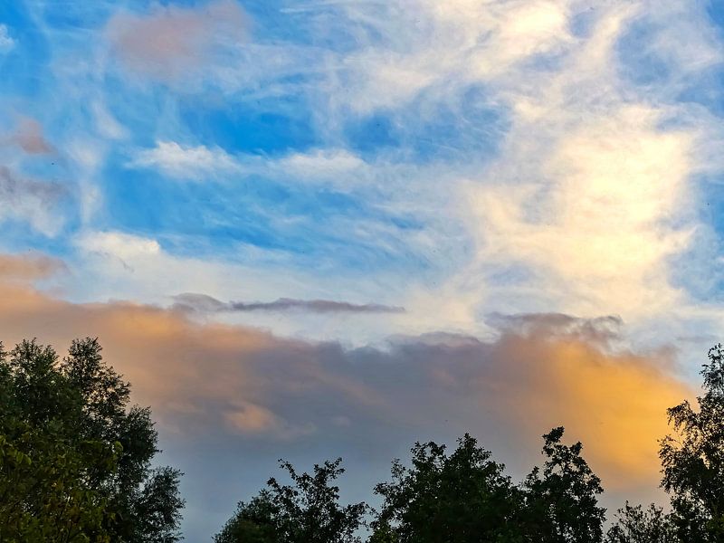On the horizon are two different layers of clouds from blue and white to orange and grey. Swaying trees as black silhouettes support this magical moment
