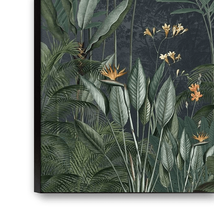 Be enchanted by the beautiful details that the soft moonlight still reveals in this dark forest. The tropical birds, colorful flowers and palm trees create a beautiful exotic atmosphere in any room.