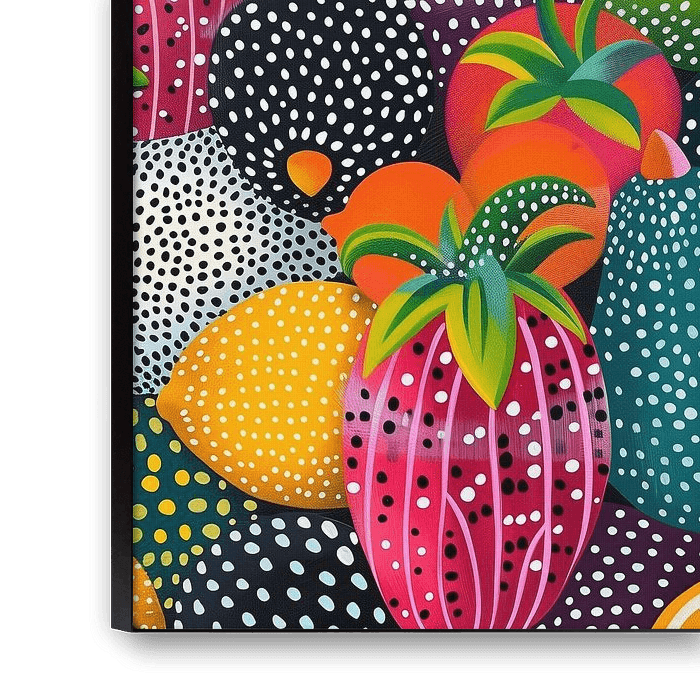 This poster for your kitchen shows exotic fruit in pop art style. However, the author was less interested in the fruit than in the decorative patterns they form. That's why he added lots of white dots, so-called polka dots. The dots hold the picture together stylistically and give it a special touch. Bring modern pop art into your kitchen - with this poster.