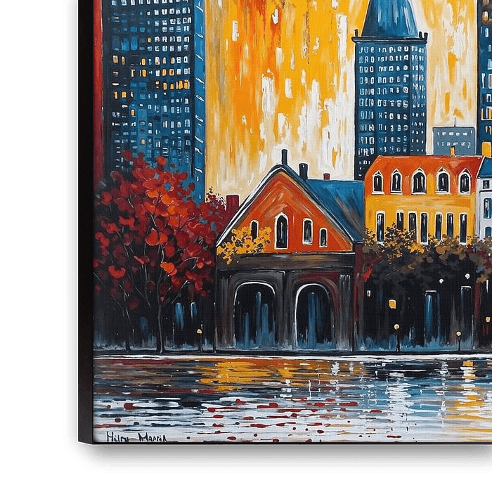 The work exudes the energy and modernity of Rotterdam: a city that reinvented itself after the ravages of World War II to become an icon of architecture and innovation. The reflections in the water refer to the Nieuwe Maas, which flows as a lifeline through the heart of the city and gives Rotterdam its unique character as a world port city. The high contrasts, rich colours and abstract accents give this work an expressionistic character and make it a visual spectacle.