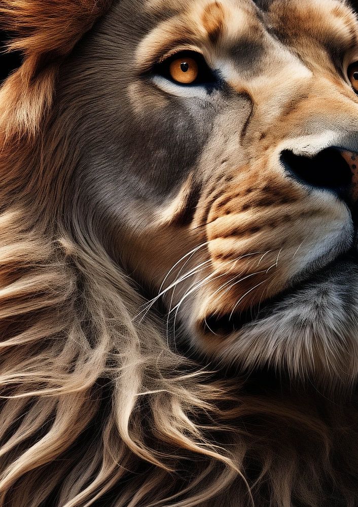 majestic portrait of a lion, a symbol of strength, pride and royal elegance. The lion is depicted with an intense, sharp gaze, directed towards the distance, creating a sense of depth and determination. His mane is lush and voluminous, painted in warm tones of gold, copper and brown, which shine against the dark, almost black background. The contrast between light and shadow emphasises the texture of his fur and adds a dramatic, almost photographic realism to the work.