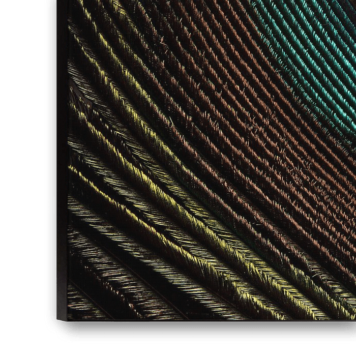 "Eyecatcher: A piece of the eye of a peacock feather" is a macro photo of a piece of a peacock feather. The structure of a peacock feather can be seen beautifully in this photograph. Because only a small part was photographed, this work takes on something abstract. Because of the colours and structure, you can recognise what it is, even if you only see a small part of this peacock feather. Despite the striking colours, this work still radiates something of tranquillity. Association: tranquillity, zen, nature, abstract, romance, love, brown tones, green tones, turquoise, blue. If I were to describe it myself, this work has a natural, rural but also an elegant, chic atmosphere. Colourful but with peace in it!