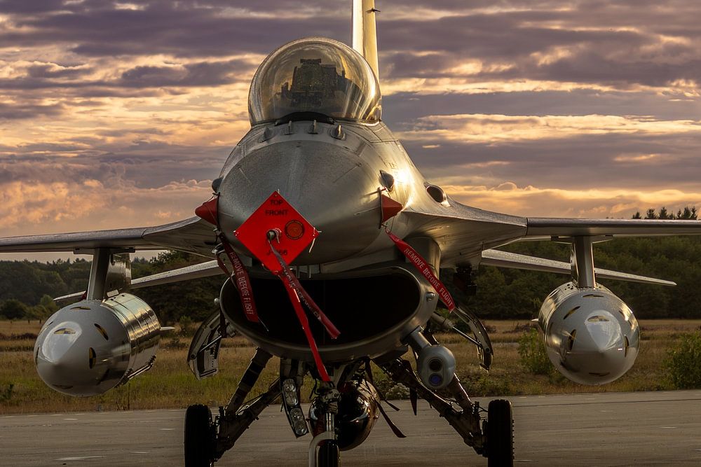 The Dutch F-16 J-066 "Orange Jumper" captured in a breathtaking moment under a brilliant blue-purple sky. The closed canopy subtly reflects the play of colours of the evening sky and emphasises the elegant lines of the fighter jet. A powerful combination of technology and nature that looks perfect as a wall decoration.