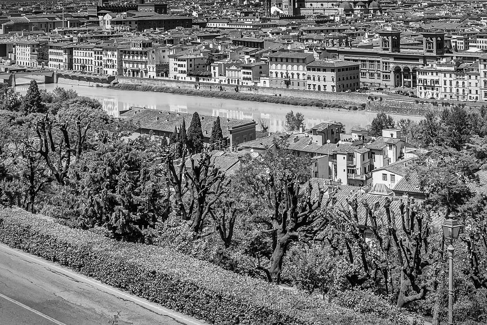 Florence is the capital city of the Italian region of Tuscany and famous for its history. Piazzale Michelangelo, Michelangelo Square, is a square with a panoramic view of the city. On this image are displayed among others Ponte Vecchio, Palazzo Vecchio, Cathedral Santa Maria del Fiore and church Santa Croce. Monochrome image of historic old town!