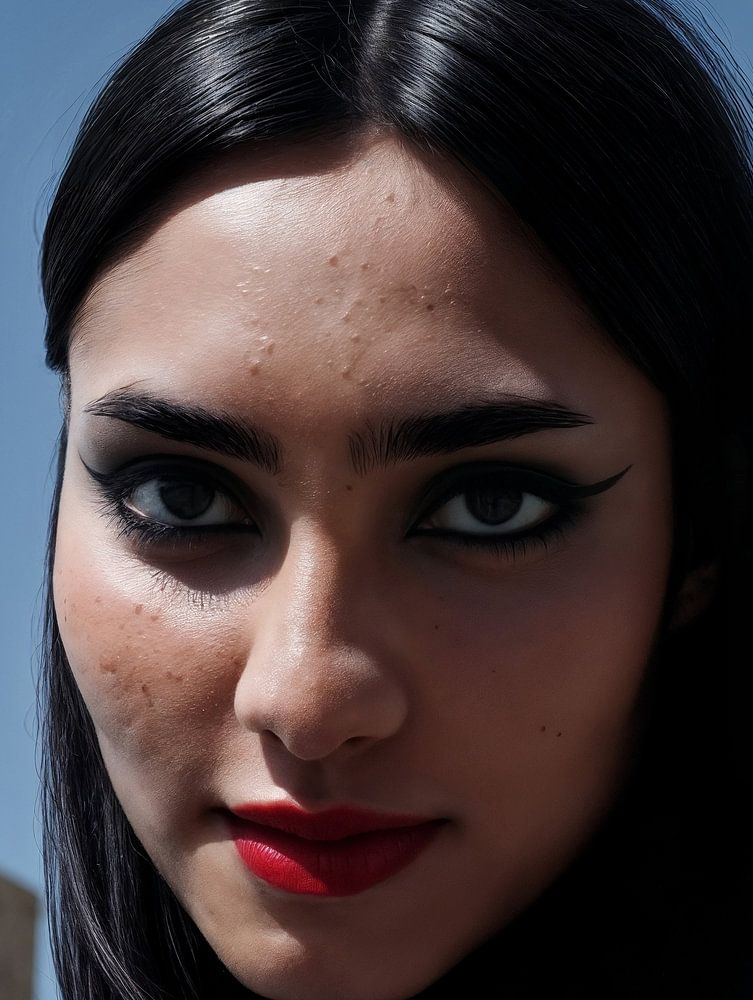 The woman shows her natural skin, including scars from acne, which makes her look genuine and human. The picture was taken outside, under a clear blue, cloudless sky. In the background is a massive concrete building.