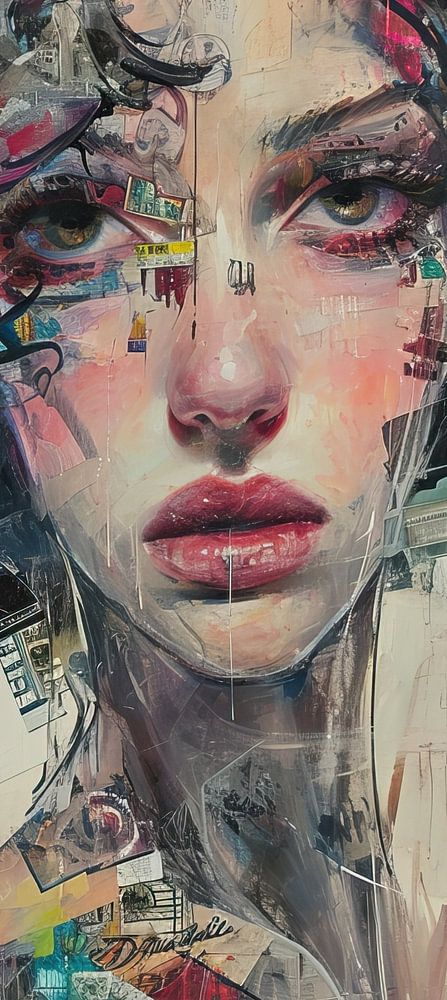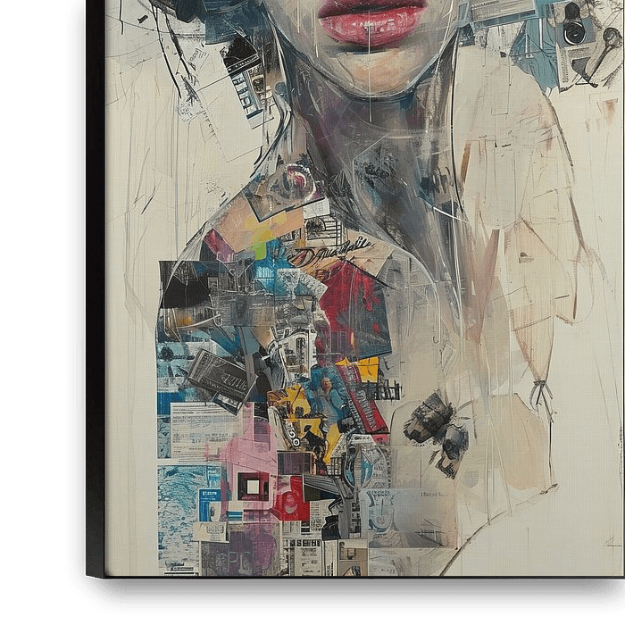 Gezicht als Stadskaart - Dit is een vrouwelijk portret waarin twee dingen je blik onmiddellijk vangen: het gezicht — en dan vooral de ogen en de lippen — en het gelaagde collageveld dat haar hals en achtergrond vormt. Het is een vrouw schilderij met het kaliber van een gesprekspartner: ze kijkt alsof ze je iets wil zeggen, terwijl de wereld om haar heen in plakjes papier en kleur is geplakt. Als kunstenaar is hier gekozen voor een spanning tussen intieme portretkunst en rauwe stadsfragmenten; het resultaat is een portret schilderij dat zowel persoonlijk als stedelijk voelt.