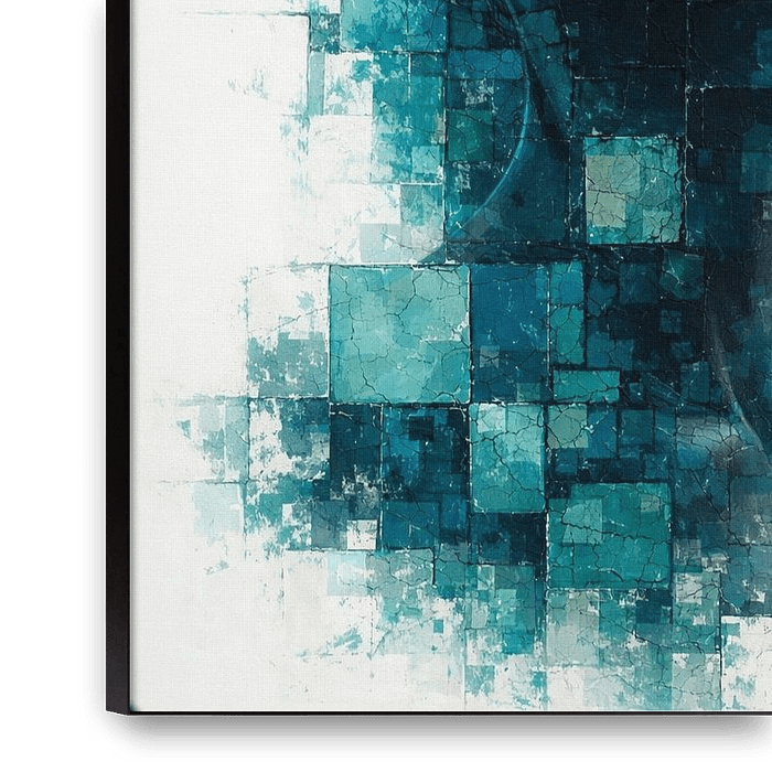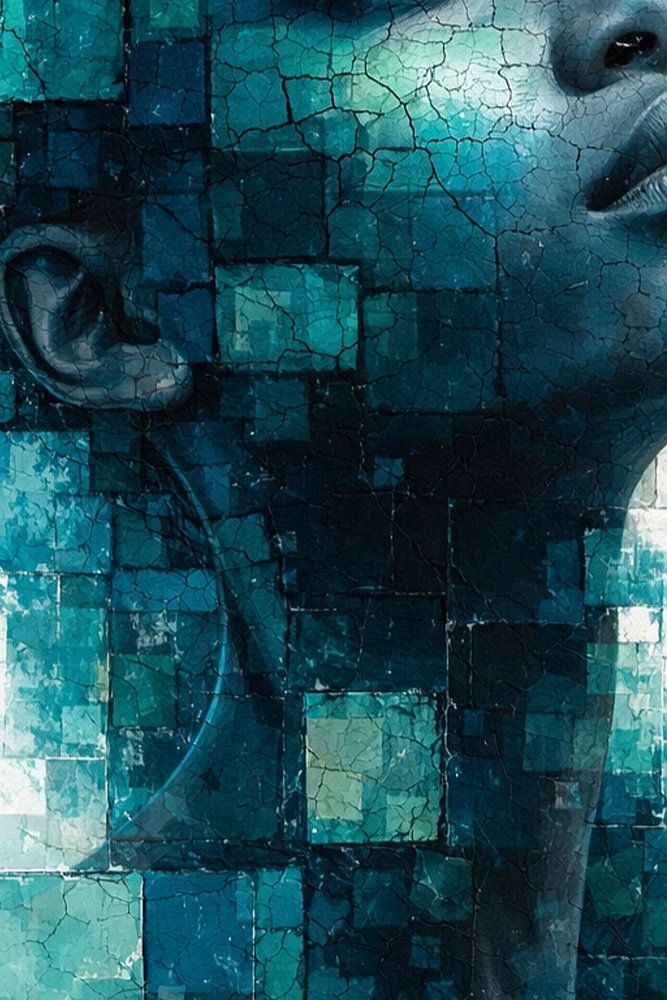 This artwork depicts a stylised portrait of a dreamy woman looking upwards, rendered in cool blue tones and turquoise accents. The face and neck are rendered realistically, while the rest of the composition transitions into an abstract pattern of square shapes that appear to be crumbling or dissolving. This combination of realism and…