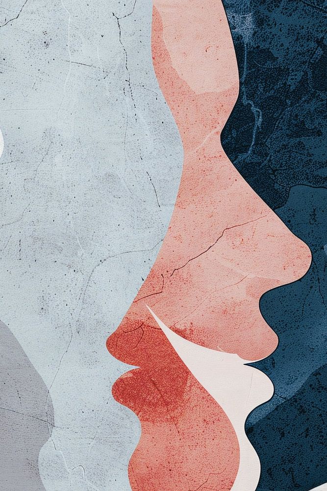 Discover the symphony of shape and colour in this intriguing design. The subtle transitions from blue to grey and the hint of red bring a dynamic contrast that captures and holds the eye. It shows a unique fusion of two faces, each carefully rendered with its own colour palette and texture, which together form a harmonious whole. This piece captures the imagination and invites the viewer to delve deeper into the complexity of human relationships and connection. Perfect for the modern living room or a creative office, where the artwork will be a source of daily inspiration and contemplation.