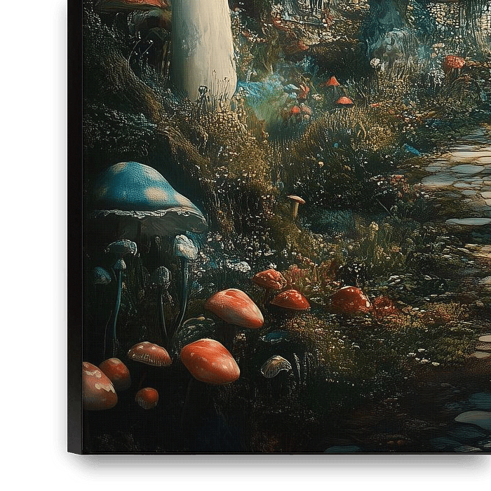 Fairy tale forest with mushrooms with a girl walking to the hidden cottage.