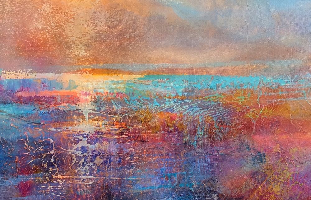 Bright light shines on the horizon and makes the abstractly painted landscape glow in all its colours.