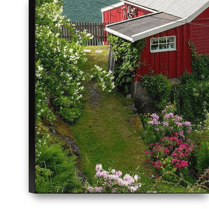 Buy the photo Fairytale Norwegian Cottage on the Fjord with Waterfall: A Timeless Refuge by Yvonne on canvas, ArtFrame, poster and wallpaper, printed on demand in high quality.