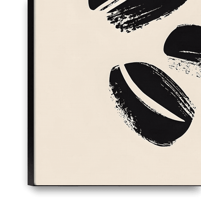 This minimalist brush line art motif shows four stylised coffee beans, dynamically distributed and with expressive brush structures. The black, abstracted shapes look lively - almost as if the beans are in motion. The warm beige-coloured background gives the motif a natural, calm base and allows the bold lines to stand out particularly…