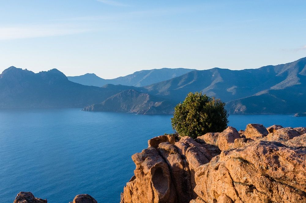 The picture shows the Gulf of Porto with the red granite rocks in the foreground. In the hazy background, the coastline of the Scandola marine reserve, which can only be explored by boat from the water, can be vaguely recognised.