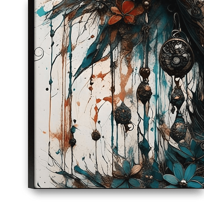 A visually intricate portrait features a female figure adorned with floral motifs and ornate jeweled embellishments. Her striking gaze emanates from a face painted with elaborate designs, framed by a swirl of abstract patterns and textures that exude a mystical aura.