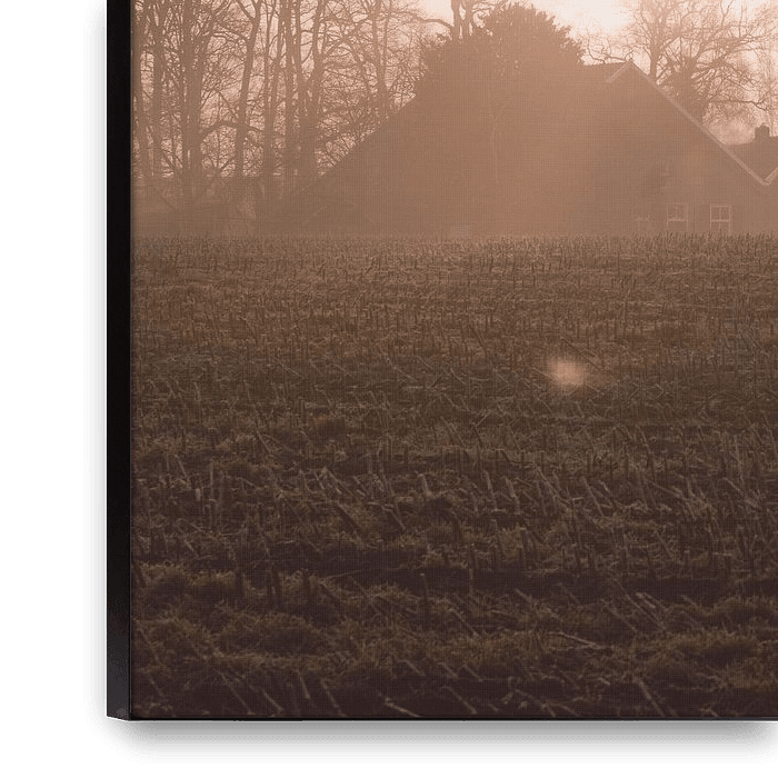 Farmhouse in the countryside in the fog with the winter morning sun trying to get through.