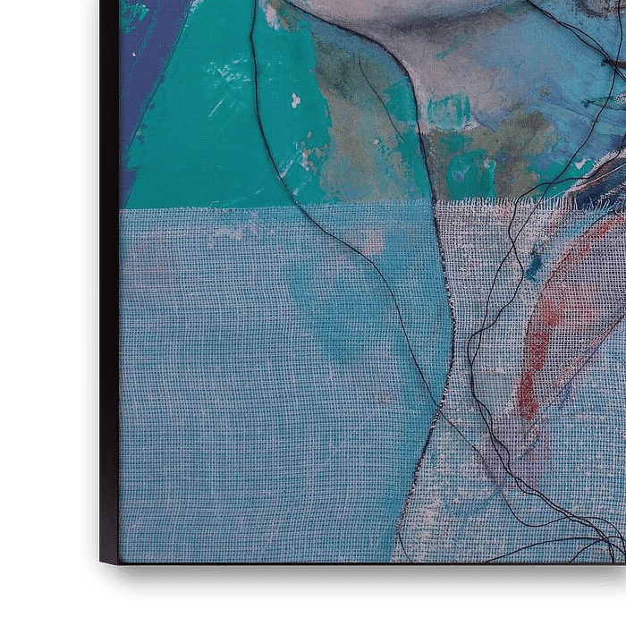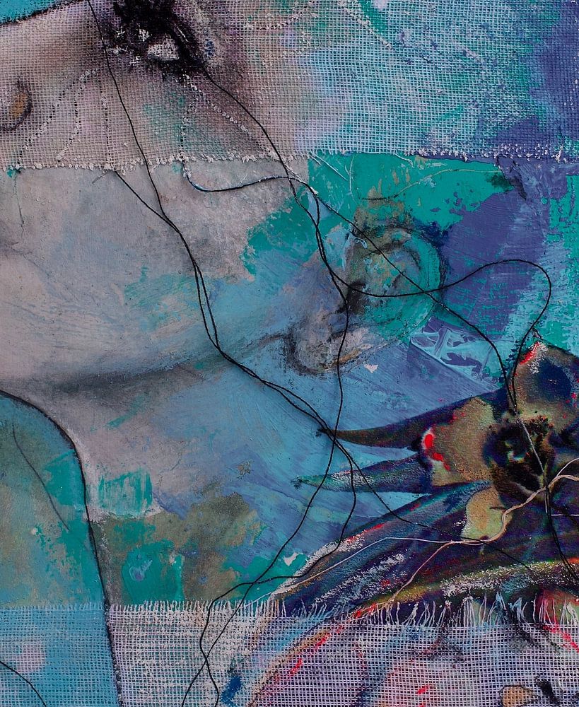 The loose threads 'fall' out of the canvas & give the work a sense of movement & freedom. Sometimes combined with ceramics, charcoal & paint, among others, Kim combines & plays to bring different materials into one.