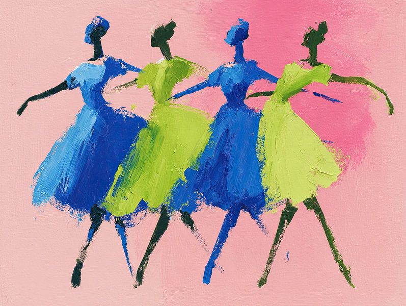 Female Dancers - This dance painting depicts four female figures in colourful dresses, with vibrant shades of blue and a fresh green dress, dancing against a soft pink background, evoking a happy and energetic atmosphere.