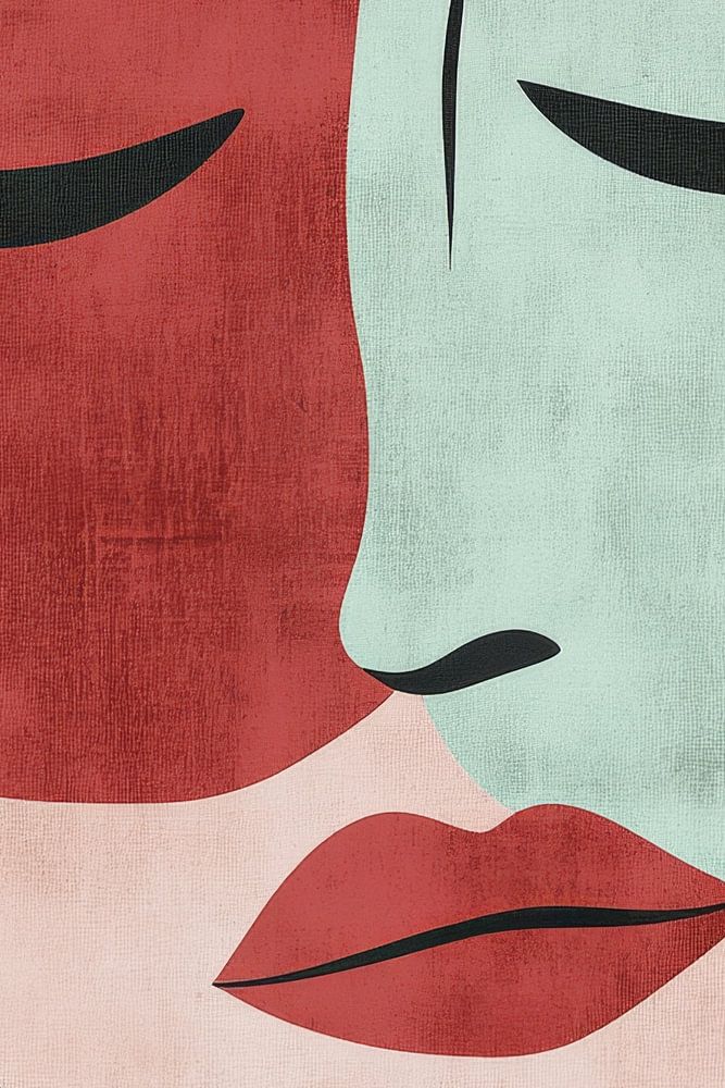 This intriguing abstract female portrait shows a face divided into two contrasting halves - one in deep red and the other in mint green. The closed eyes and stylised lips exude serenity and inner peace. The simple yet powerful shapes create a harmonious balance between colour and stillness. This artistic composition is ideal for modern interiors with a penchant for minimalist and symbolic art.