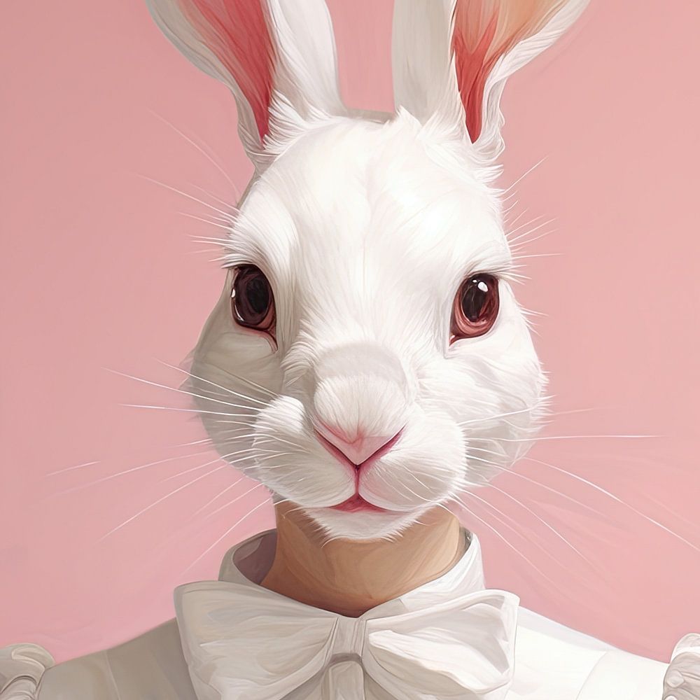This enchanting portrait painting captures the essence of playfulness and mystery in one image. On a square canvas in soft pink pastel colours, an intriguing woman wearing a rabbit mask comes to life. Her gaze, deep and penetrating, seems to bridge the gap between the human world and the realm of these fluffy creatures.