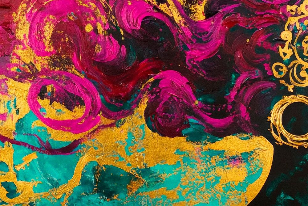 A fascinating play of colours unfolds as vibrant crimson curls flow into golden and turquoise streams like an artistic waterfall. The stylish silhouette exudes strength and grace, perfect for a modern living room that exudes creativity and energy. Create an inspiring centrepiece for social gatherings!