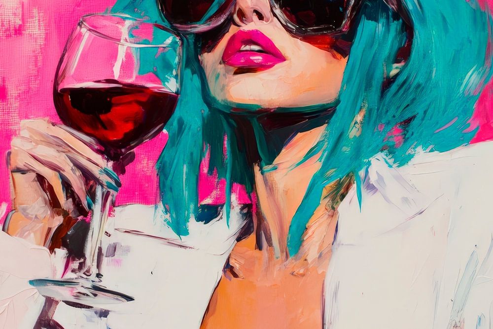 A lively homage to self-confidence and style! With her bright turquoise hair and oversized sunglasses, the character radiates pure elegance and playfulness. The bold, pink-coloured background reinforces the energetic atmosphere. Perfect for a modern living room or a bar where creativity and fun meet!