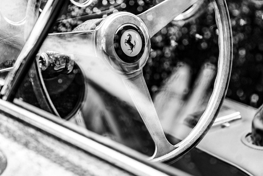 Ferrari 250 GT Berlinetta Lusso 1960s classic Italian GT car. Dashboard view in black and white.