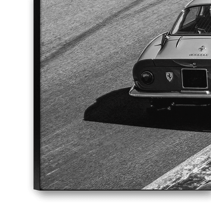 Ferrari 275 GTB classic GT car driving through Eau Rouge up Raidillon at the Spa Francorchamps race track. Black and white photo.