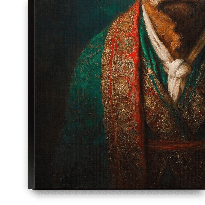 This artwork shows a proud Scottish Highlander looking calmly forward. The warm orange fur stands out beautifully against the dark background. The Scottish tartan Christmas hat adds a playful winter feel. The dress is richly decorated with shades of green and red that combine to create a luxurious look. The gold patterns in the fabric…