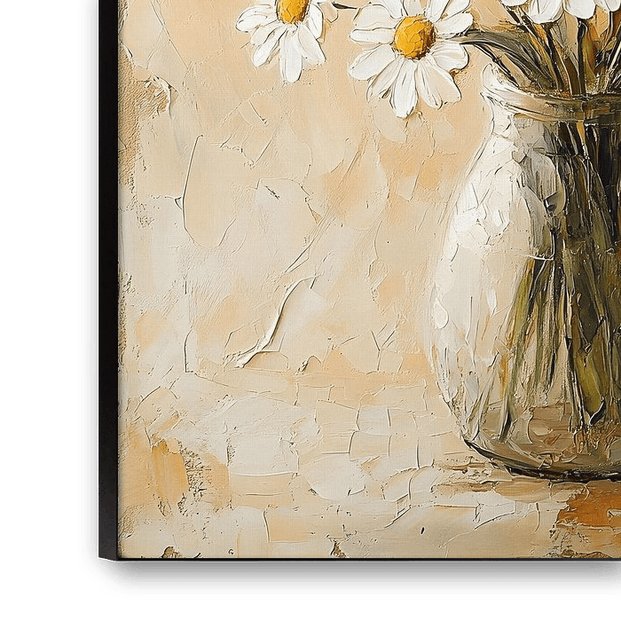 A tender bouquet of white daisies comes to life in thick brushstrokes and palette knife texture, placed in a simple glass vase against a weathered background. This warm, nostalgic work exudes tranquillity and rural charm.