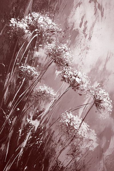 In this black-and-white-and-pink rendering, a tranquil moment in nature unfolds. Slender stems of umbelliferous flowers rise from a field of soft, muted greys. Their delicate flower heads spread out like tiny stars or delicate lace patterns, light and almost weightless against the background.